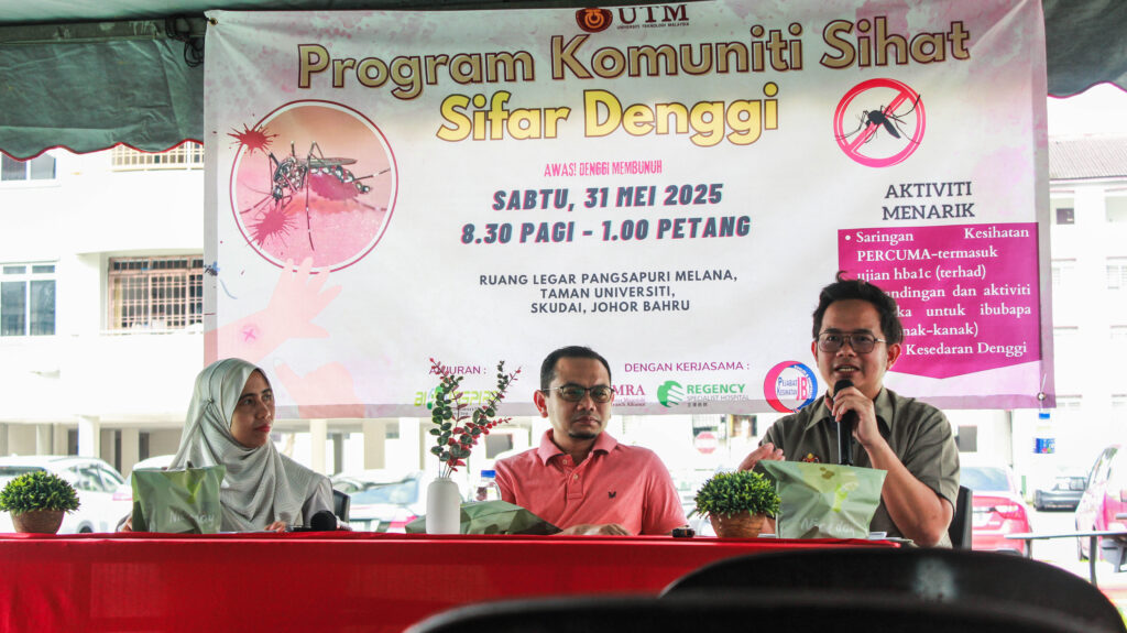 JOHOR BAHRU, 31 Mei – Program Komuniti Sihat, Sifar Denggi anjuran Kumpulan Penyelidikan Peranti dan Kejuruteraan Tisu Terinspirasi Bio (BIOINSPIRA), Universiti Teknologi Malaysia (UTM), di bawah Penyelidikan Bersekutu Bahan Keterhadapan (FMRA) dengan kerjasama Pejabat Kesihatan Daerah Johor Bahru, dan Hospital Pakar Regency, telah berjaya dilaksanakan pada hari Sabtu, 31 Mei 2025 bertempat di Ruang Legar Pangsapuri Melana, Taman Universiti, Skudai.