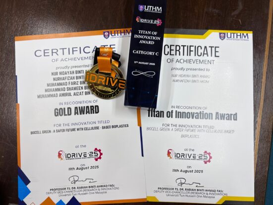 PAGOH, Aug 11 – BioCell Green, an eco-friendly electrolyte platform made from cellulose, has received the Gold Award and was recognized as the top achiever for the TITAN of Innovation Award at the International Development, Research & Innovation Exhibition 2025 (iDRIVE’25). This event was organized by Universiti Tun Hussein Onn Malaysia (UTHM).