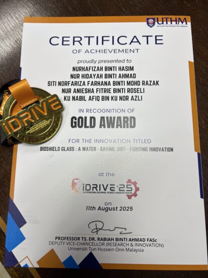 JOHOR BAHRU, Aug 11 – A team of researchers from the Department of Physics, Faculty of Science, Universiti Teknologi Malaysia (UTM) has achieved remarkable success by winning the Gold Award at the prestigious Innovation, Design & Research International Venture Creation 2025 (iDRIVE2025) competition, hosted by Universiti Tun Hussein Onn Malaysia (UTHM). The winning project, titled BioShield Glass, was led by Dr. Nurhafizah Hasim together with her colleagues Dr. Nur Hidayah Ahmad, Siti Norfariza Farhana Mohd Razak, Nur Aniesha Fitrie Roseli, and Ku Nabil Afiq Ku Nor Azli – all dedicated researchers from UTM’s Department of Physics.