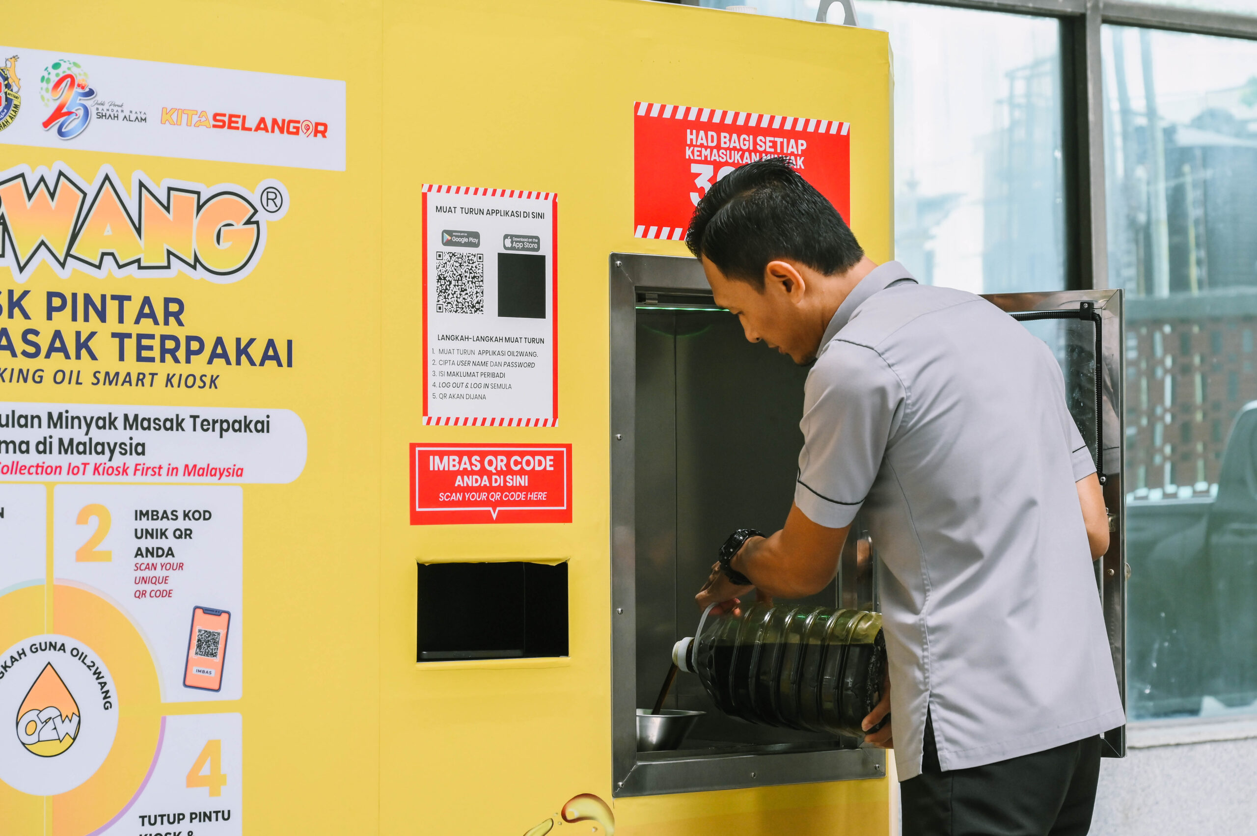Menariknya, inisiatif ini bukan sekadar menggalakkan amalan hijau, tetapi juga menjana nilai ekonomi kepada komuniti. Kiosk pintar Oil2Wang® menawarkan harga belian minyak masak terpakai sebanyak RM2.50 sekilogram melalui aplikasi mudah alih khusus, dan bayaran dimasukkan terus ke akaun bank pengguna. Dengan itu, masyarakat bukan sahaja membantu mengurangkan pencemaran air akibat pembuangan minyak ke saliran, tetapi turut menerima manfaat kewangan secara langsung.