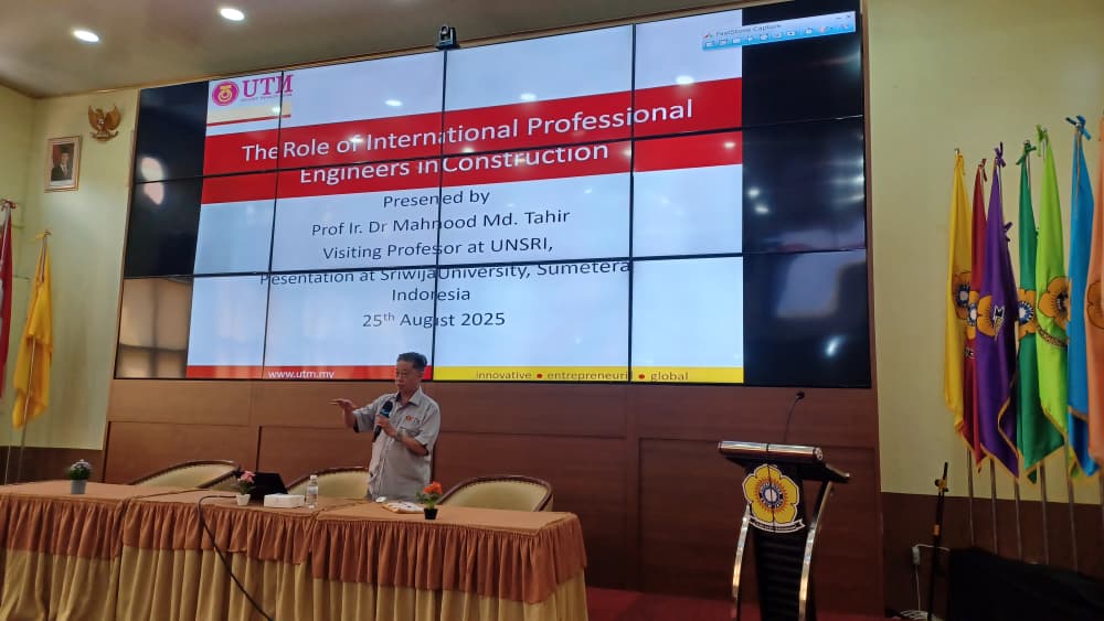 PALEMBANG, 27 Ogos – Universiti Teknologi Malaysia (UTM) memperkukuh hubungan akademik dan penyelidikan melalui kunjungan kerja rasmi ke Universitas Sriwijaya (UNSRI), Palembang, Indonesia melalui inisiatif Geran Padanan Penyelidikan serta perasmian kemudahan penyelidikan baharu di kampus tersebut. Lawatan yang diketuai oleh Prof. Ir. Dr. Mahmood Md. Tahir ini turut disertai oleh penyelidik UTM iaitu Prof. Ts. Dr. Safian Sharif, Prof. Madya Ir. Dr. Shek Poi Ngian, Prof. Madya Ir. Ts. Dr. Mohd Azlan Suhaimi, dan Ir. Ts. Dr. Nor Hasanah Abdul Shukor Lim.