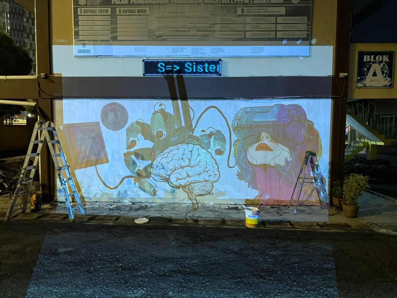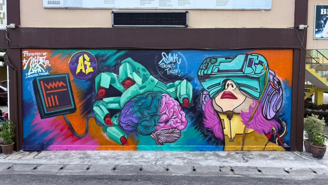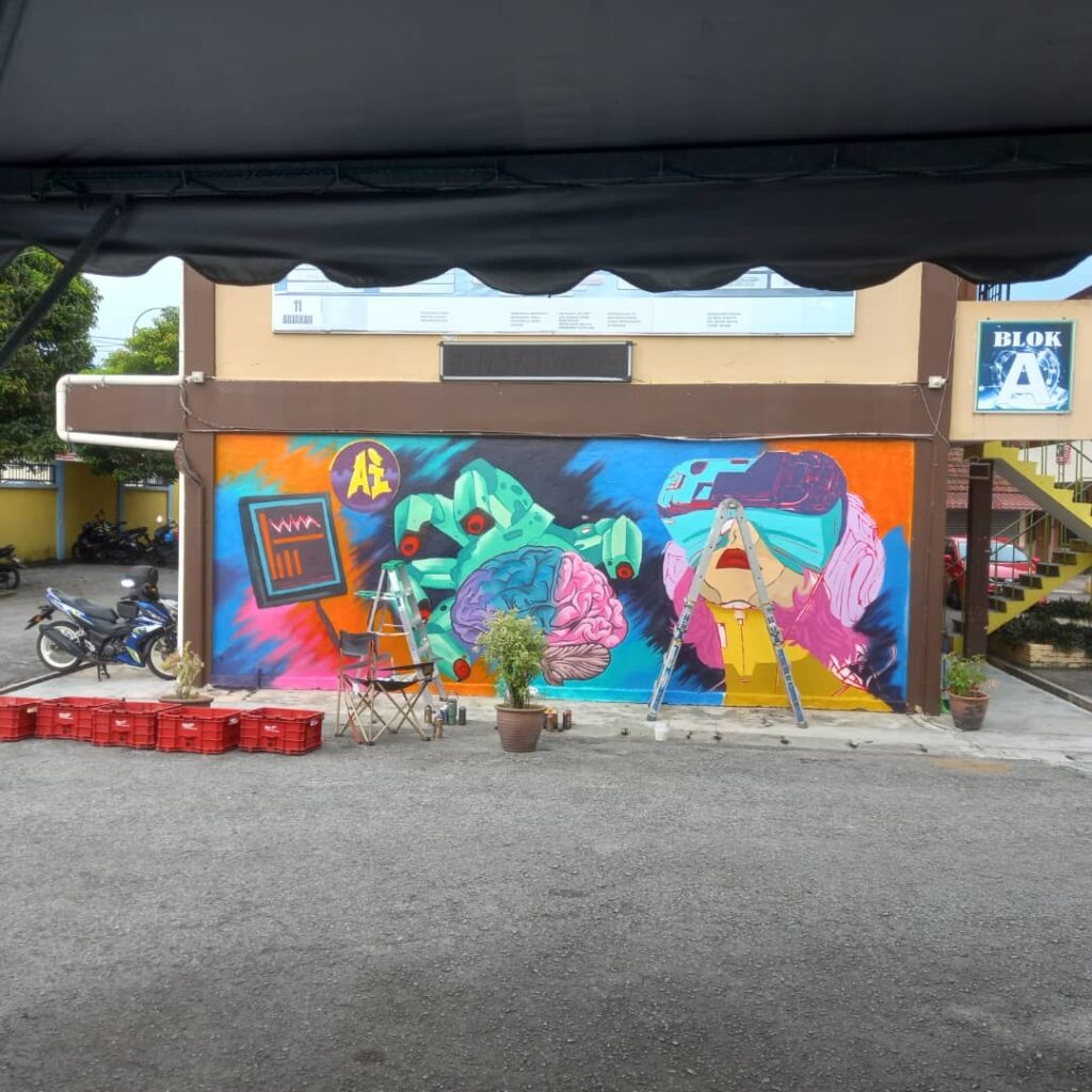 KUALA LUMPUR, 26 Sept.– Fakulti Kecerdasan Buatan (FAI), Universiti Teknologi Malaysia (UTM) dengan kerjasama Sekolah Menengah Kebangsaan Padang Tembak (SMKPT) dan artis mural, MILE09 telah melaksanakan satu projek mural interaktif bertemakan Kecerdasan Buatan (AI). Inisiatif ini merupakan projek dibawah Dana Program Pemindahan Ilmu – Geran Teknologi Penyelidikan (KTP-RIG), Pusat Jaringan Komuniti dan Industri (CCIN) yang diketuai oleh Dr. Nuraihan Ismail, Pensyarah Kanan Program Sarjana Muda Sains (Rekabentuk Industri) dengan kepujian (SRTIH), FAI UTM.