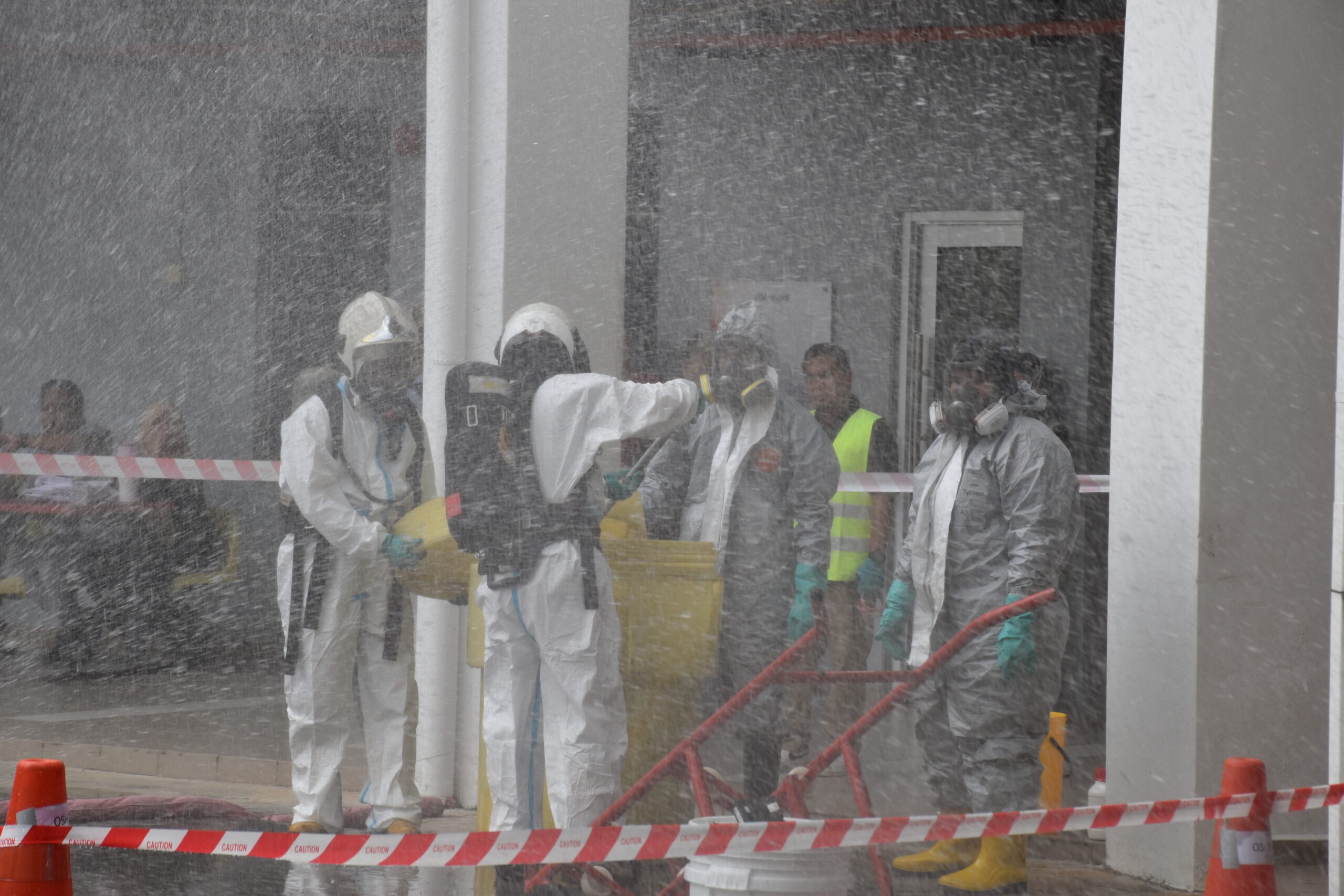 Pengalihan trafik dan pejalan kaki di kawasan berhampiran turut dilaksanakan dengan bantuan ERT Fakulti dan Bahagian Keselamatan UTM. Pasukan HAZMAT yang lengkap memakai Peralatan Perlindungan Diri (PPE) memulakan operasi menyelamat mangsa dan seterusnya melaksanakan kerja pembersihan menggunakan bahan penyerap khas bagi mengekang limpahan. Semua sisa buangan yang dikumpul dilabel dan disediakan untuk proses pelupusan mengikut peraturan ditetapkan. Proses terakhir ialah dekontaminasi terhadap peralatan dan mangsa yang dijalankan oleh pasukan HAZMAT.