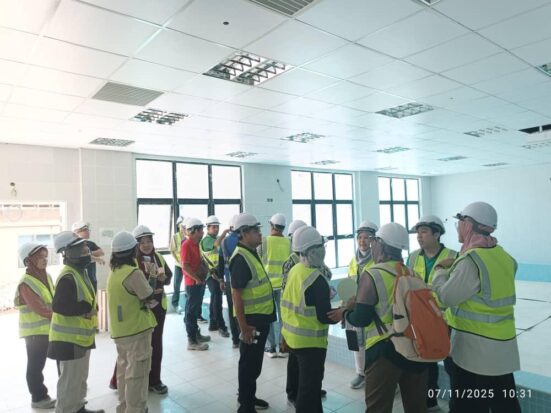 The final stop was the Hospital Petra Jaya project site, a 300-bed tertiary hospital in Kuching. Through presentations and discussions, students reviewed the implementation of resilient and specialised infrastructure, noting that the project is a “rescue project” tasked with completing works previously left abandoned. The hospital design incorporates innovations in infection control and asset durability, including stainless-steel wall panels in the Central Sterile Supply Department (CSSD), which are resistant to harsh chemical disinfection, and seamless polyurethane (PU) flooring in high-risk areas such as the Mortuary. This flooring eliminates grout lines—common sites for bacterial growth—making it a critical infection-control measure.