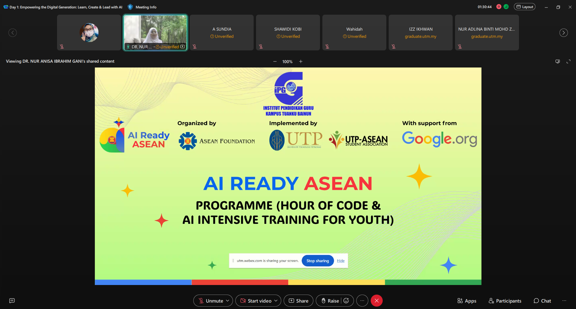 The programme was delivered by Dr Nur Anisa Ibrahim Gani, a certified Association of Southeast Asian Nations (ASEAN) AI Trainer, alumna of the Faculty of Educational Sciences and Technology (FEST), UTM, and former committee member of the Postgraduate Student Society (PGSS). Her engagement as a UTM alumna exemplified the University’s commitment to strengthening alumni-industry-academia linkages, while offering participants valuable insights grounded in real-world applications and regional best practices.