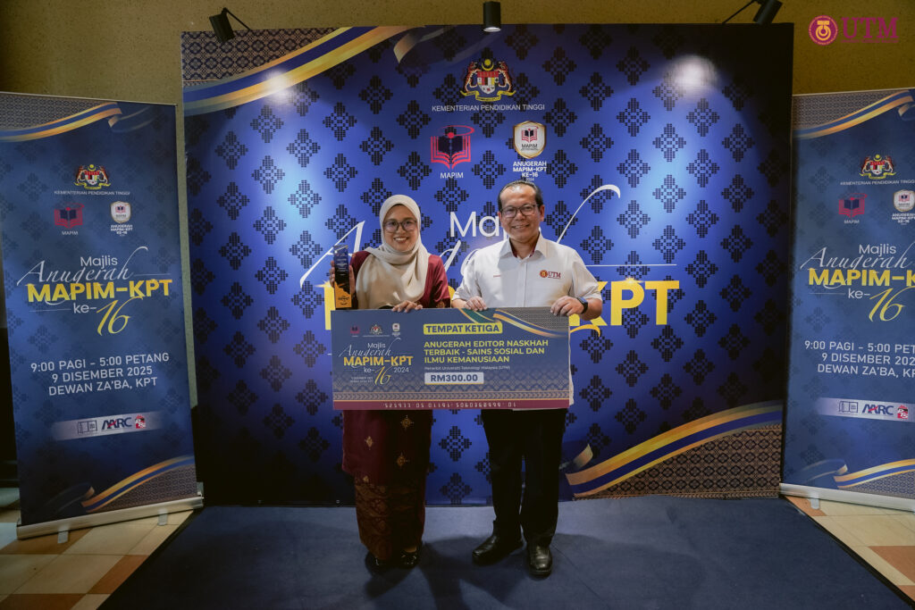 PUTRAJAYA, 9 Dis – Universiti Teknologi Malaysia (UTM) terus mengukuhkan kedudukannya sebagai universiti penyelidikan berimpak tinggi selepas meraih kejayaan cemerlang dalam Majlis Anugerah MAPIM–KPT Kali Ke-16 yang berlangsung di Dewan Za’aba, Kementerian Pendidikan Tinggi (KPT), Putrajaya. Penganugerahan berprestij ini menjadi pengiktirafan tertinggi terhadap usaha institusi pendidikan tinggi dalam memperkasa bidang penerbitan ilmiah negara.