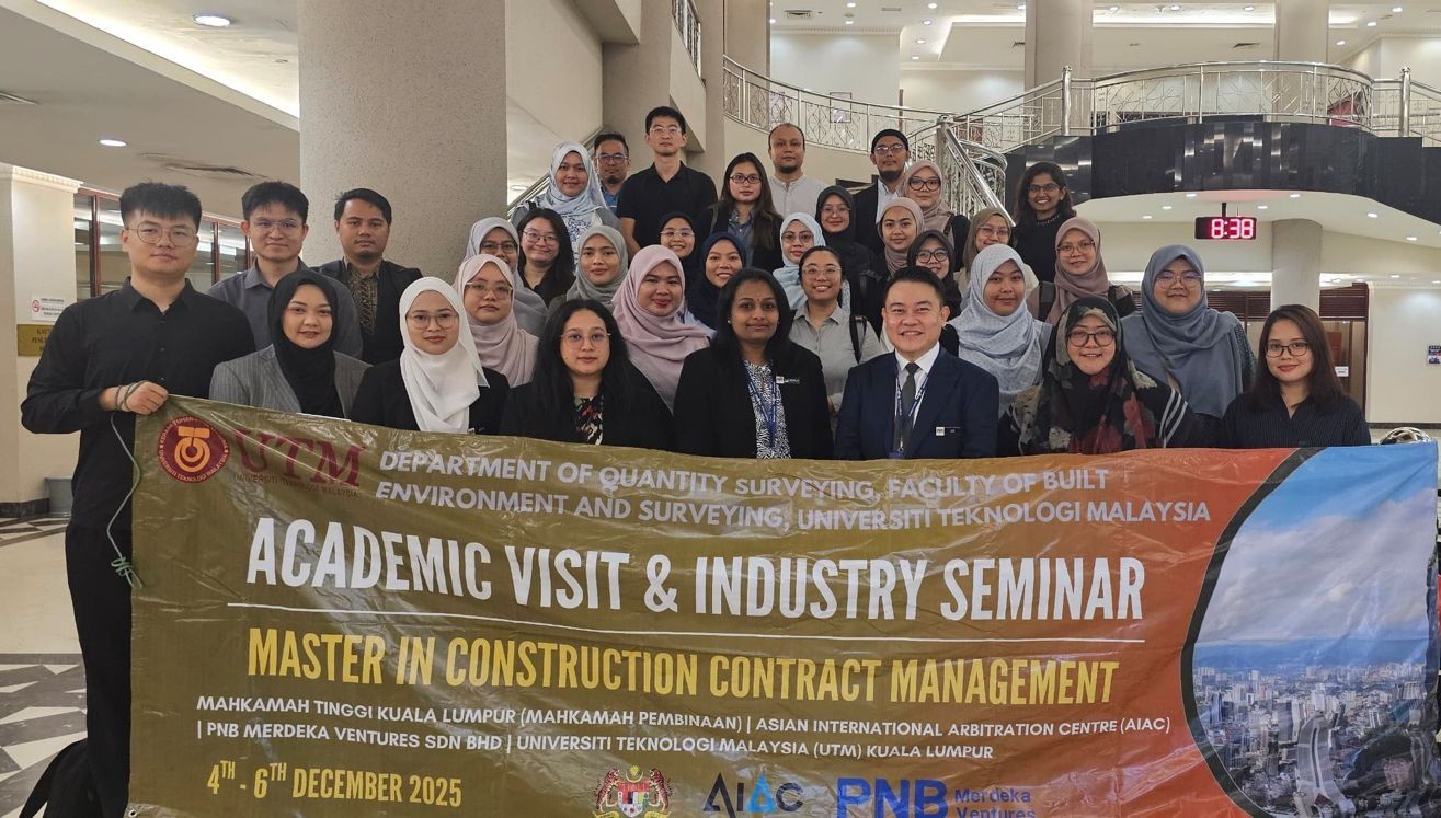 KUALA LUMPUR, Dec 6 – The Construction Contract Management (CCM) Industrial Visit and Academic Seminar, held from 4 to 6 December 2025, reflects Universiti Teknologi Malaysia’s (UTM) ongoing commitment to practice-integrated postgraduate education, strategic industry engagement, and professional capacity building in construction law and dispute resolution. Organised by the Master’s in Construction Contract Management (CCM) programme under the Faculty of Built Environment and Surveying (FABU), the programme was designed not merely as an academic visit but as a platform for long-term institutional engagement, curriculum enrichment, and potential strategic collaboration with key dispute-resolution stakeholders.