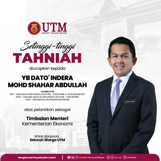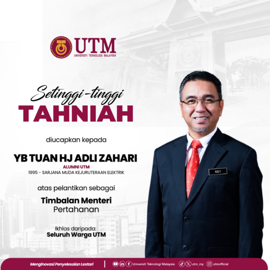 UTM turut berbangga melihat alumni universiti terus memainkan peranan penting dalam kepimpinan awam di peringkat tertinggi negara, selaras dengan aspirasi untuk melahirkan graduan yang bukan sahaja cemerlang daripada segi akademik dan profesional, malah berteraskan nilai, etika serta semangat khidmat kepada masyarakat dan negara, sejajar aspirasi Malaysia MADANI.