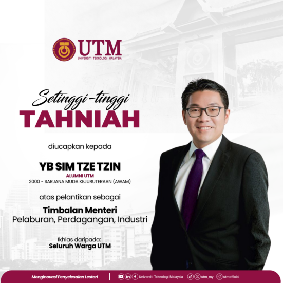 JOHOR BAHRU, 17 Dis – Universiti Teknologi Malaysia (UTM) merakamkan ucapan tahniah kepada tiga alumni yang telah dilantik sebagai ahli kabinet baharu kerajaan MADANI berkuat kuasa hari ini. Pelantikan ini mencerminkan kepercayaan negara terhadap keupayaan serta kepimpinan graduan UTM dalam menyumbang kepada tadbir urus dan pembangunan negara.