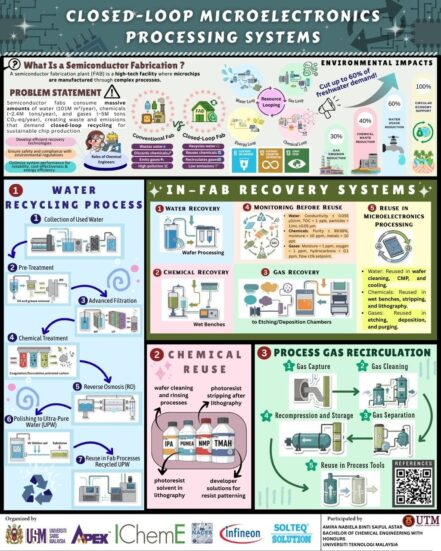 Under the guidance of Dr Amnani Shamjuddin, Amira Nabiela presented her infographic on Closed-Loop Microelectronics Processing Systems, which highlighted how semiconductor fabrication plants can reduce their heavy resource consumption through recycling and recovery systems. Conventional fabrications consume vast amounts of water, chemicals, and gases, but closed-loop approaches can cut water demand by up to 60 per cent, chemicals by 40 per cent, and gases by 30 per cent. Her work illustrated advanced water recycling, chemical purification, and process gas recirculation, all while meeting strict purity standards and supporting a circular economy in chip manufacturing.