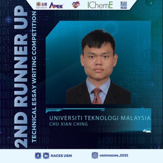 Organised in 2025 by Universiti Sains Malaysia with the support of The Institution of Chemical Engineers (IChemE), NACES is an annual international symposium previously hosted by Universiti Malaya andUniversiti Kebangsaan Malaysia. The competition was conducted through online submissions and attracted strong participation from chemical engineering undergraduates nationwide.