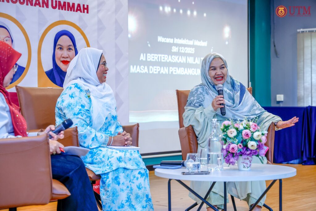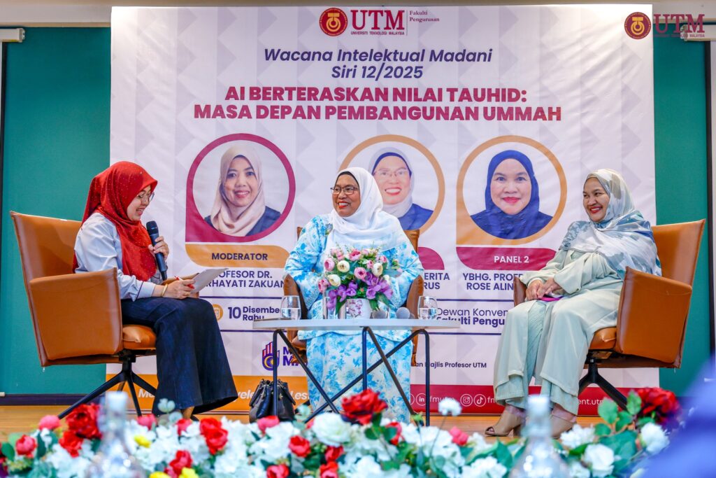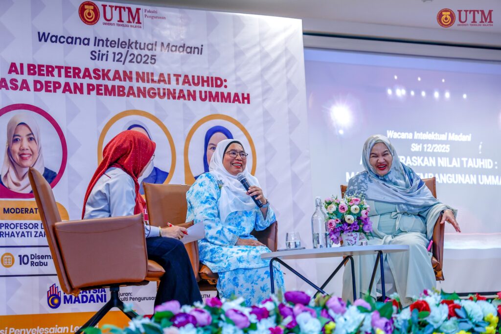JOHOR BAHRU, 10 Dis – Wacana Intelektual MADANI Siri 12/2025 anjuran Fakulti Pengurusan, Universiti Teknologi Malaysia (UTM) membuka perbincangan signifikan mengenai peranan kecerdasan buatan atau AI apabila ia dibangunkan dan diguna pakai berlandaskan nilai Tauhid sebagai tonggak pembentukan ummah. Program yang berlangsung di Dewan Konvensyen Fakulti Pengurusan itu menampilkan dua tokoh ilmuwan berpengaruh iaitu Prof. Emerita Dr. Durrishah Idrus sebagai panel pertama dan Prof. Dr. Rose Alinda Alias sebagai panel kedua, manakala sesi dipengerusikan oleh Prof. Dr. Norhayati Zakuan selaku moderator.