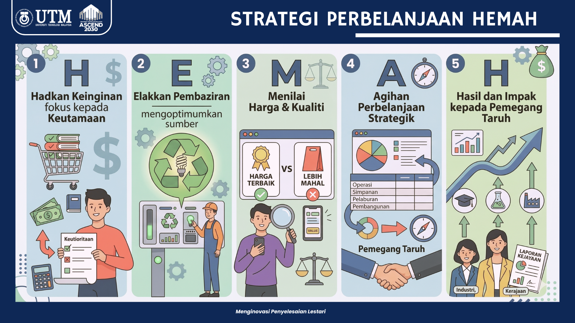 “Warga universiti perlu sentiasa menghadkan keinginan dengan memberi tumpuan kepada agenda utama serta mengelakkan pembaziran melalui pengoptimuman sumber sedia ada. Setiap tindakan perlu dinilai dari aspek harga dan kualiti bagi memastikan pulangan terbaik kepada organisasi, selain agihan sumber dilaksanakan secara strategik dan terancang,” katanya.