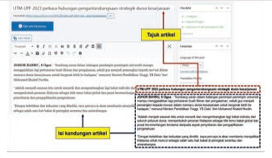 5.2.1 Pengguna boleh memuat naik tajuk artikel dan isi kandungan artikel dengan mudah menggunakan arahan copy (Ctrl + C) dan paste (Ctrl + V) seperti dalam Rajah 1.