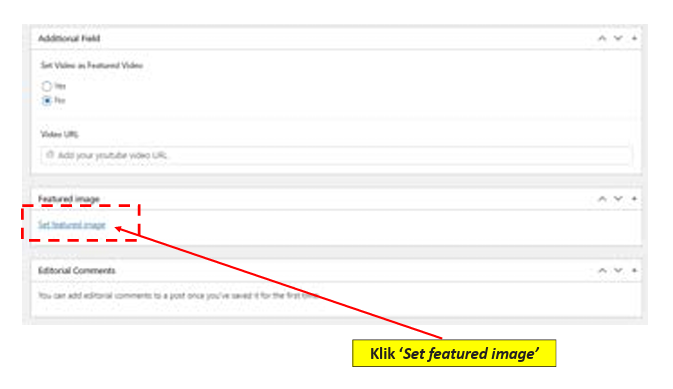 (c) Video dari laman YouTube perlu dimasukkan pada ruangan ‘Additional Field’ dengan memilih butang ‘Yes’ bagi ‘Set Video as Featured Image’ seperti dalam Rajah 12.