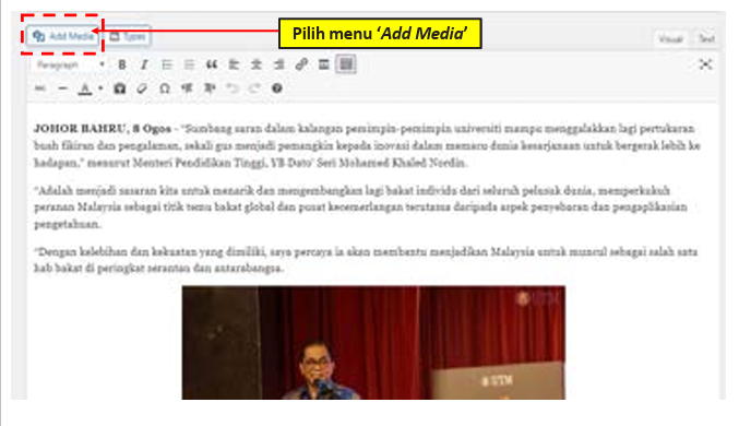 5.2.2 Pengguna digalakkan untuk merangka dan menulis draf artikel di MS Word terlebih dahulu, sebelum memuat naik draf tersebut ke WordPress Editor.